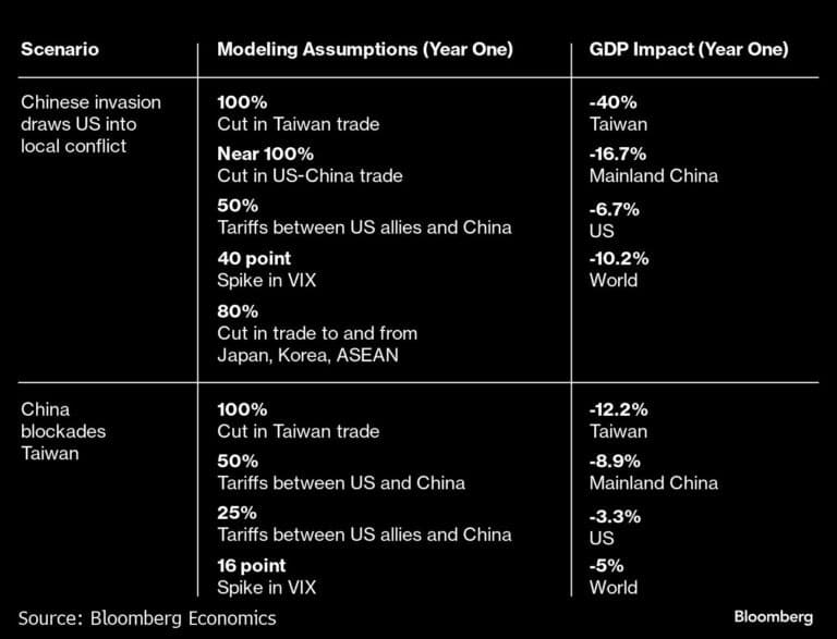Wpływ wojny w Tajwanie na PKB globalnie i wg. państw – szacunki Bloomberga. Wojna z Tajwanem spowodowałaby prawdopodobnie ok. 10% spadek światowego PKB; to więcej, niż pandemia Covid-19. Źródło: Bloomberg Economics