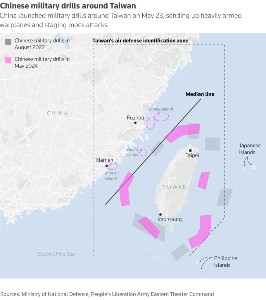 Dowództwo Teatru Wschodniego Chińskiej Armii Ludowo-Wyzwoleńczej poinformowało, żerozpoczęło ćwiczenia z udziałem marynarki wojennej i sił powietrznych. Różnice? Ćwiczenia „Joint Sword – 2024A” i mają trwać 2 dni, zatem prawdopodobnie zakończą się dzisiaj. Jednak w przeciwieństwie do podobnych manewrów w kwietniu 2023, oznaczono je jako „A”. Jak raportuje Reuters, ma to otwierać drzwi do potencjalnych kontynuacji. Ćwiczenia realizowane są w Cieśninie Tajwańskiej, na północy, południu i wschodzie Tajwanu, a także na obszarach wokół wysp Kinmen, Matsu, Wuqiu i Dongyin. Wcześniejsze manewry nie odbywały się wokół wysp. Oficjalnie wzięło w nich udział 15 okrętów marynarki wojennej, 16 okrętów straży przybrzeżnej i 33 samoloty. Wojna w Tajwanie byłaby katastrofą dla globalnego PKB (-10% wg. szacunków Bloomberg Intelligence).