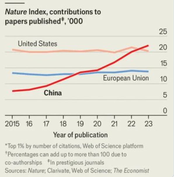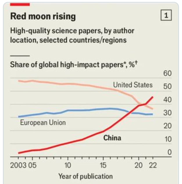 Wojsko USA ma przewagę, Chiny nadrabiają zaległości – także w zaawansowanej technologicznie broni. Mowa o dronach i pociskach hipersonicznych. Odpowiedź Waszyngtonu? Większe zaangażowanie innych, zaawansowanych technologicznie uczestników, którzy w scenariuszu wojny mają ’skin in the game’. Mowa o Korei Południowej i Japonii. Już teraz Stany korzystają z tamtejszych stoczni. Nie zmienia to faktu, iż także na tym polu przepaść między USA, a Chinami może się pogłębiać. Ilośc cytowanych artykułów chińskich naukowców globalnie rośnie, podczas gdy w USA i Unii Europejskiej spada.