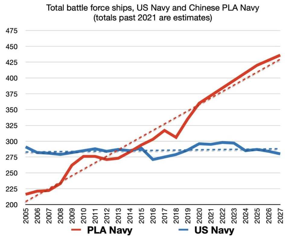 Jeśli nie wydadzą Chinom bitwy na Pacyfiku zawczasu, zaryzykują utratę statusu globalnego hegemona, kontrolującego światowe morza. Przyjrzyjmy się temy i sprawdźmy, co pokazała analiza Foreign Policy. Raport Pentagonu na temat potęgi militarnej Chin z 2023 r. wskazał, iż chińska marynarka wojenna ma około 370 okrętów wojennych. Jej flota wzrośnie do 395 statków, do 2025 roku. Osiągnie 435 statków do 2030 roku. Tymaczasem, obecna flota USA liczy ponad 280 okrętów. Sekretarz Marynarki Wojennej spodziewa się osiągnąć liczbę 300 jednostek … Na początku lat 2030. Przyjrzyjmy się sprawie nieco głebiej.