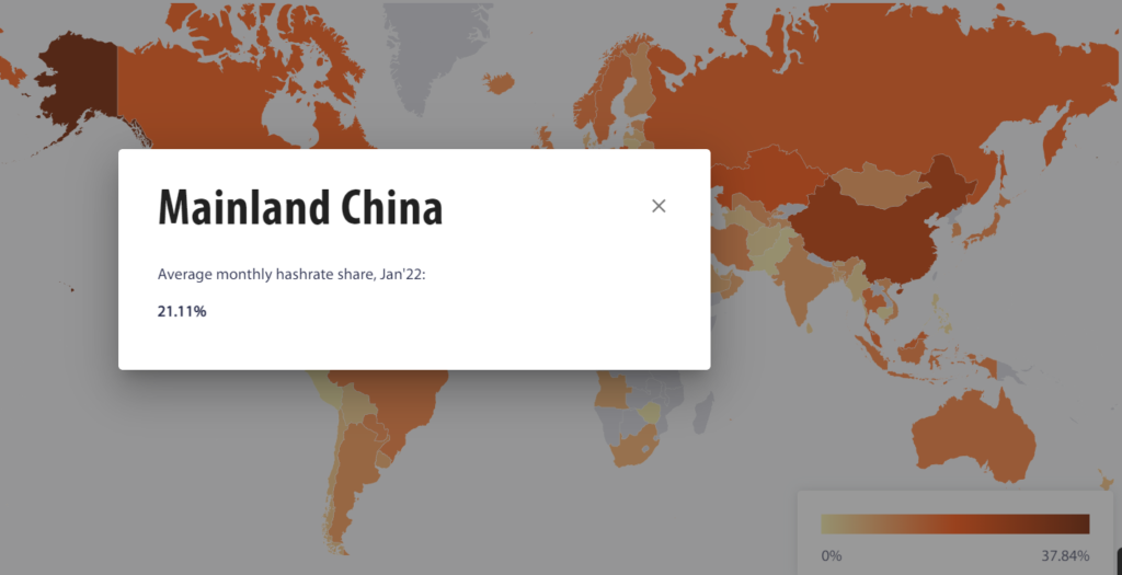 W zeszłym roku Chiny zakazały kopania kryptowalut oraz handlu nimi. Zakaz ten nie jest jednak skrupulatnie przestrzegany i państwo środka ciągle posiada około 21 % mocy wydobywczej bitcoina.