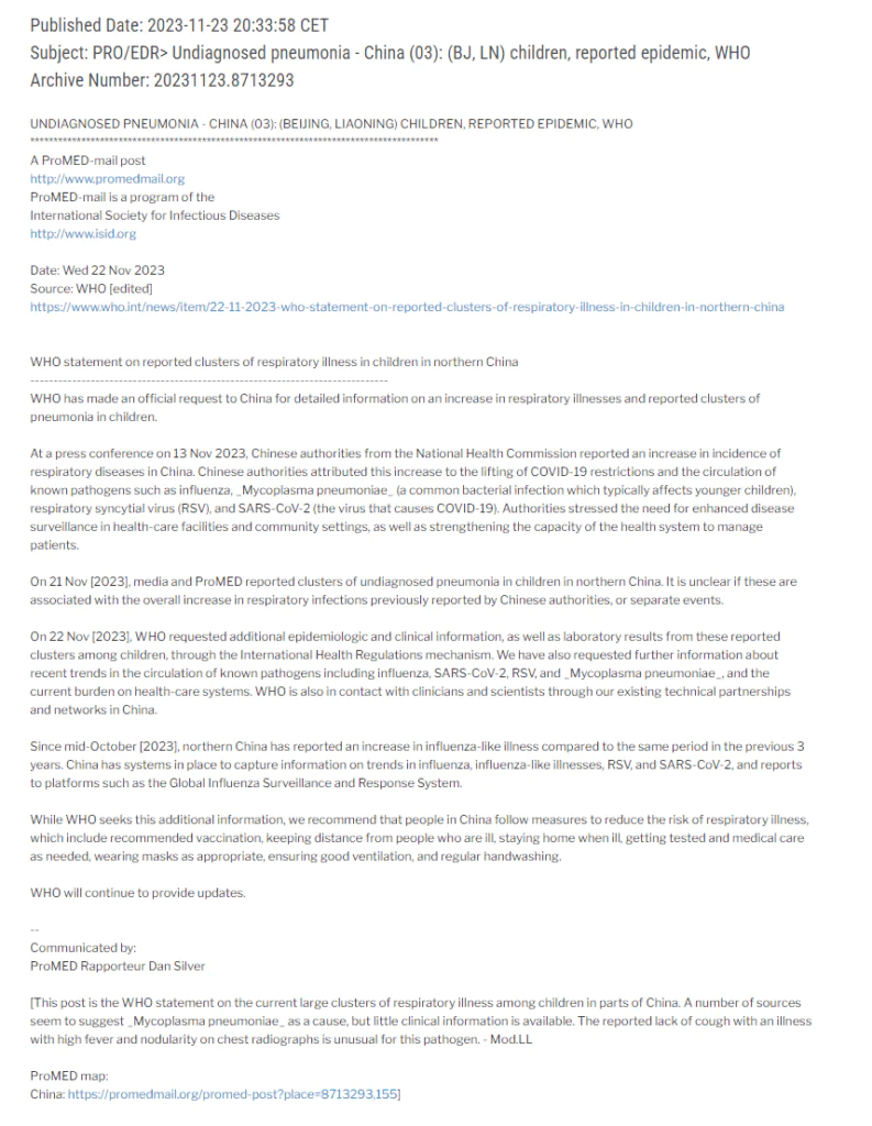 Alert, który wywołał globalny niepokój, został wydany we wtorek przez ProMED, serwis monitorujący powiązany z Międzynarodowym Towarzystwem Chorób Zakaźnych. Notka wzywa do przesyłania możliwie jak najszybciej wszelkich dodatkowych informacji na temat przypadków „niezdiagnozowanego zapalenia płuc” w północnych Chinach, przywołując na myśl pierwsze w historii powiadomienie o przypadkach COVID-19 w grudniu 2019 roku.