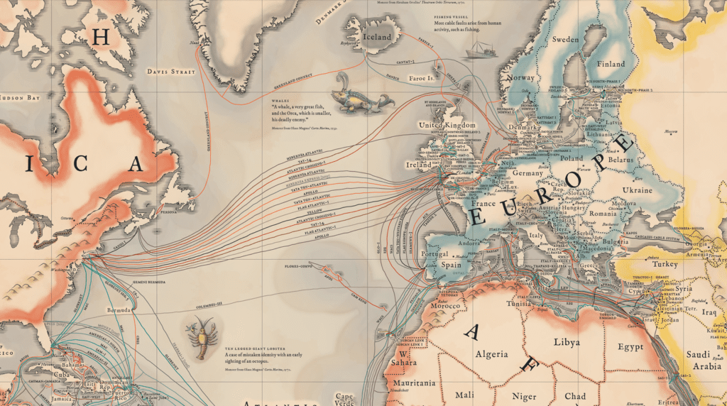 Mapa internetowych kabli łączących Stany Zjednoczone z Europą. Źródło: MapsInternet