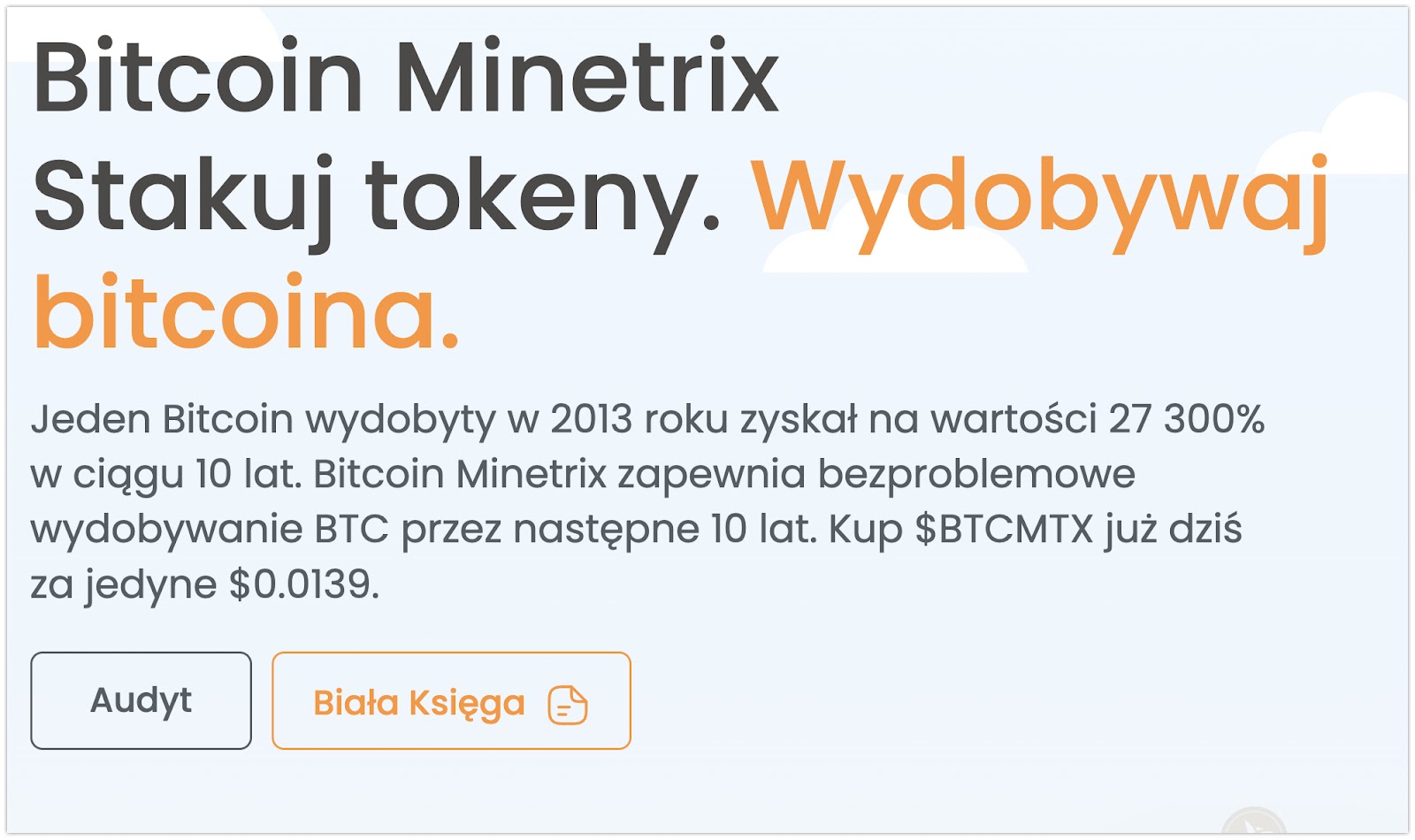 Bitcoin Minetrix to tokenizowana platforma wydobywcza, która działa w chmurze. Zbliża się ona do 11 milionów dolarów zebranych w przedsprzedaży (ICO). Projekt ma na celu zapewnienie codziennym entuzjastom kryptowalut prostego sposobu na zarabianie Bitcoinów poprzez wydobywanie w chmurze bez ryzyka związanego z dostawcami zewnętrznymi lub zakupem specjalistycznych koparek.