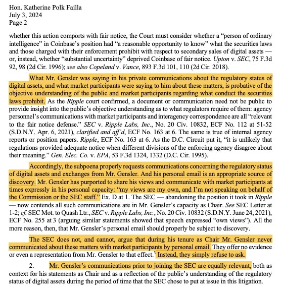źródło: CourtListenerW odpowiedzi Coinbase opisało argument SEC jako bezpodstawny, zauważając, iż jego prośba była istotna dla zrozumienia poglądów przewodniczącego na temat zasobów cyfrowych i federalnych przepisów dotyczących papierów wartościowych. Jak podkreślono, komunikacja Genslera z uczestnikami rynku jest kluczowa dla uzyskania wglądu w stanowisko agencji w sprawie regulacji aktywów cyfrowych. „To, co pan Gensler mówił w swojej prywatnej komunikacji na temat statusu regulacyjnego aktywów cyfrowych i co uczestnicy rynku mówili mu o tych sprawach, jest dowodem obiektywnego zrozumienia opinii publicznej i uczestników rynku w odniesieniu do tego, jakiego postępowania zabraniają przepisy dotyczące papierów wartościowych” – napisano.