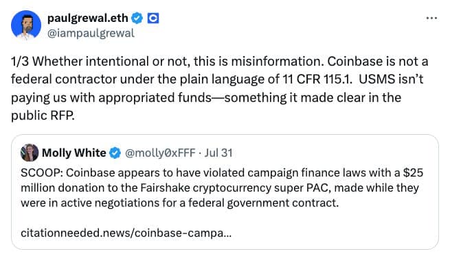 Grewal odrzucił te twierdzenia w poście opublikowanym wczoraj na platformie X. Zapewnił, iż Coinbase nie było wykonawcą federalnym zgodnie z klauzulą „prostego języka” Kodeksu Przepisów Federalnych 111.51. „USMS nie płaci nam z przyznanych środków – to coś, co zostało jasno określone w publicznym (zapytaniu ofertowym – przyp. red.]. Niezależnie od tego, czy jest to zamierzone, czy nie, jest to dezinformacja” – stwierdził Grewal.