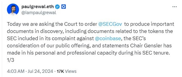 Nowy wniosek został złożony przez przedstawicieli Coinbase 23 lipca br. Dotyczy on materiałów związanych z wystąpieniami Genslera na temat legislacji dotyczącej aktywów cyfrowych. Firma twierdzi, iż te zapisy mają najważniejsze znaczenie w zwalczaniu oskarżeń o udział w nielegalnej sprzedaży niezarejestrowanych papierów wartościowych. „Dokumenty związane z tą komunikacją bezpośrednio odnoszą się do twierdzeń podnoszonych w tej chwili przez SEC oraz do obrony Coinbase w sprawie uczciwego powiadomienia” – napisał na platformie X Paul Grewal, dyrektor prawny Coinbase.