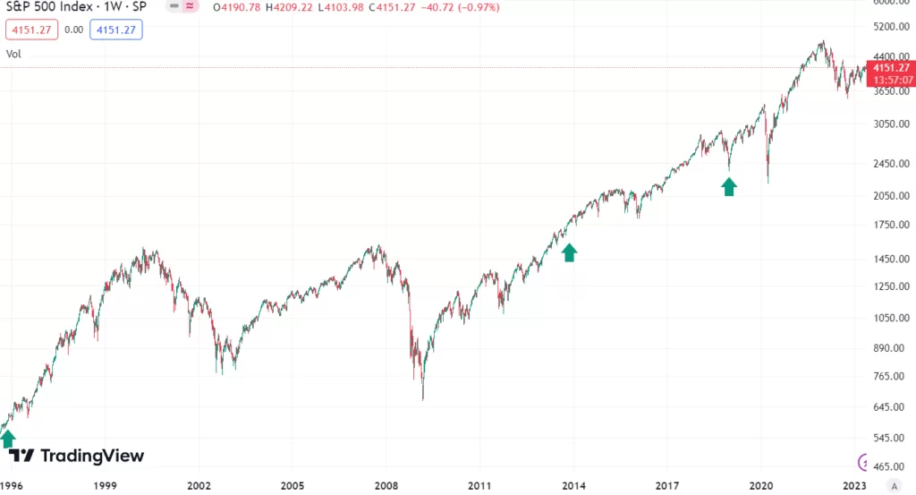 Źródło: TradigViewJak pokazuje historia, każdy kryzys był okazją do zakupów na długi termin. Ze wspomnianych trzech dużych zamknięć rządu tylko jedno można znaleźć bez trudu na wykresie. Był to przełom lat 2018 i 2019 i najdłuższy Government Shutdown w historii. Warto zauważyć, iż spadki w tym przypadku zaczęły się przed ryzykiem zamknięcia rządu. Kiedy to już miało miejsce, rynek zaczął rosnąć. Oczywiście zachowanie giełdy w przeszłości nie jest gwarancją, iż podobny schemat się powtórzy.