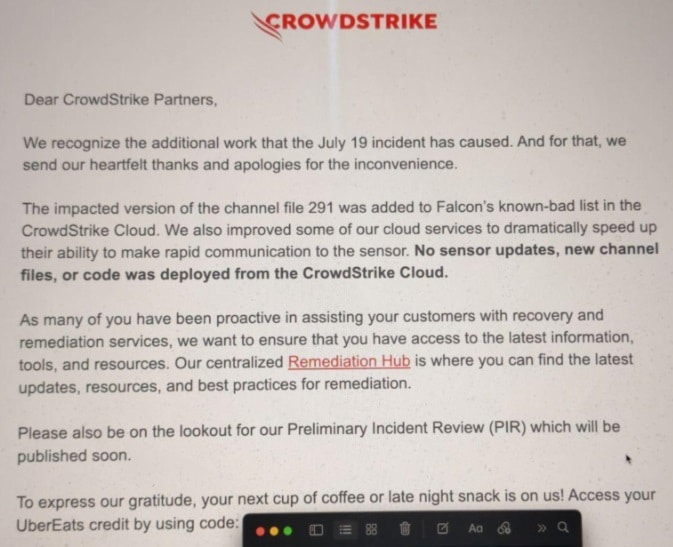 CrowdStrike przeprasza i przekazuje bony do UberEats w ramach zadośćuczynienia