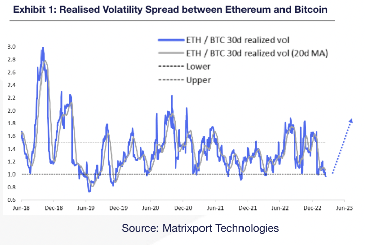 Źródło: Matrixport TechnologiesHistoryczna zmienność pary ETH/BTC wskazuje na możliwe odreagowanie w górę po tym jak w tej chwili ma miejsce spadek w okolice 1.0 – historycznie poziom ten stanowił istotne dolne ograniczenie. „Rozpiętość zmienności pomiędzy Ethereum a Bitcoin skompresowała się do poziomu poniżej 1. Zdarzało się to tylko sporadycznie, a rozpiętość handlowana była powyżej 1 w 93% obserwacji w ciągu ostatnich czterech lat” – zauważył Markus Thielen, szef badań i strategii w Matrixport w nocie dla klientów z wtorku. Według dostawcy usług kryptowalutowych Matrixport, najlepszym sposobem na radzenie sobie w niepewnej sytuacji na rynku takiej jak obecnie, z Shanghai Upgrade zbliżającym się w marcu jest handel na parach kryptowalutowych, gdize traderzy obstawiają relatywną siłę między nimi:
