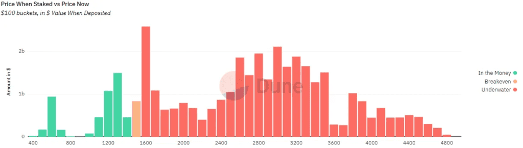 Rozkład stakujących Ethereum. Zdecydowana ich większość tonie w stratach. Źródło: Dune AnalyticsRealizacja zysków czy wzrosty?