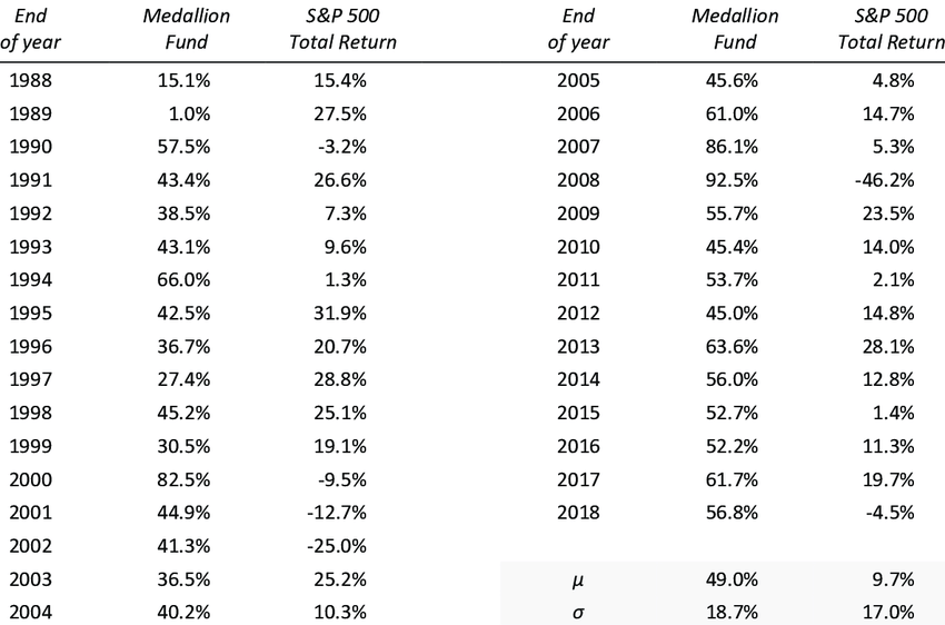 Zestawienie zwrotów Medallion vs S&P 500 1988 – 2019. Źródło: Dr.Wealth Skoro niepoliczalne to… Nie liczyć?