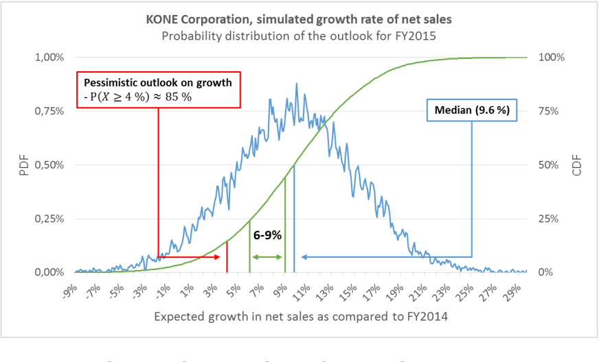 Symulacja (Monte Carlo) dystrybucji prawdopodobieństwa sprzedaży fińskiej frimy KONE Corp. r/r (2014/2015). Wynik wyniósł 12%, w górnym zakresie prognozy (model sugerował wysokie prawdopodobieństwo). Źródło: schemanticscholar. KONE CorpPopularne metody matematyczne cz. I