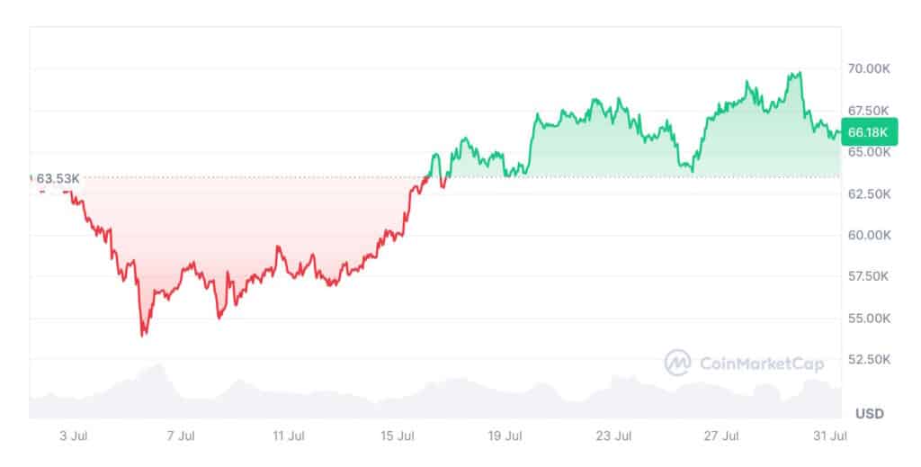 Wartość BTC w ciągu ostatich 30 dni (źródło: CoinMarketCap)W miniony poniedziałek – 100 dni po kwietniowym halvingu, który miał miejsce 29 lipca – Bitcoin był notowany tylko o 2,11 proc. wyżej na poziomie 66 343 USD, Co ciekawe, w momencie publikacji niniejszego artykułu znajdował się już powyżej tego poziomu – jego wartość wynosiła 66 410,.
