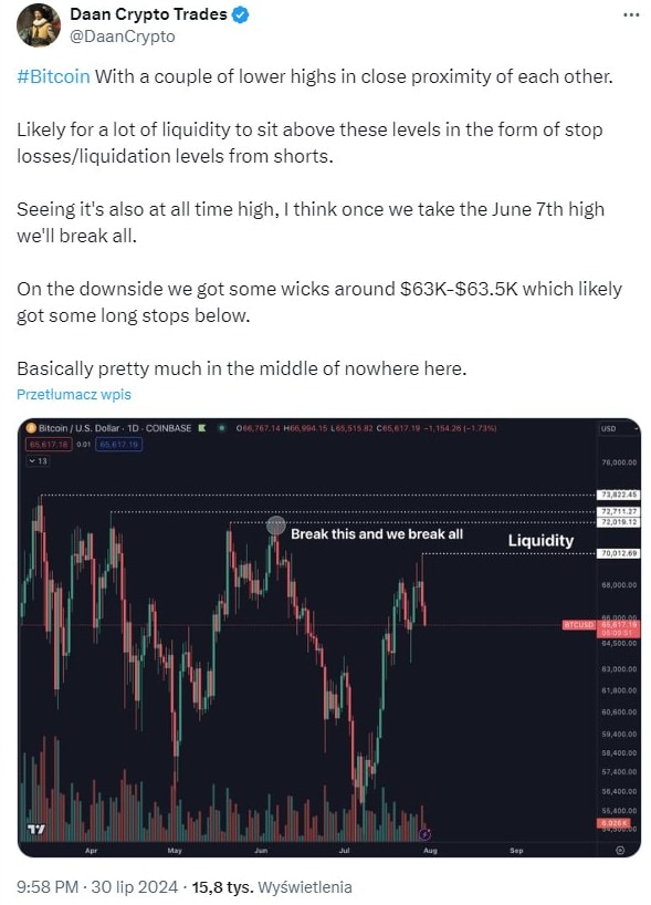 Tymczasem traderzy są zdania, iż Bitcoin z większym prawdopodobieństwem przekroczy granicę 100 000 USD w 2025 r., a nie w 2024 r., jak przewidywano wcześniej. „Moim zdaniem wykres Bitcoina w wyższych ramach czasowych wygląda dla świetnie” – stwierdził trader kryptowalut ukrywający się pod pseudonimem Daan Crypto Trades. „Myślę, iż sześć cyfr w tym roku może być nieco za wcześnie, ale jestem przekonany, iż zobaczymy to gdzieś w 2025 roku” – dodał, powołując się na pozytywne dane makroekonomiczne. „W ostatnim cyklu osiągnęliśmy szczyt na poziomie 69 tys., a 100 tys. stanowiłoby jedynie 1,5-krotny wzrost w stosunku do poprzedniego rekordu wszech czasów. jeżeli weźmiemy pod uwagę inflację w tym czasie, to choćby mniej, więc myślę, iż 100 tysięcy dolarów jest całkowicie rozsądnym celem, biorąc pod uwagę, gdzie znajduje się w tej chwili świat i przestrzeń kryptowalutowa”.