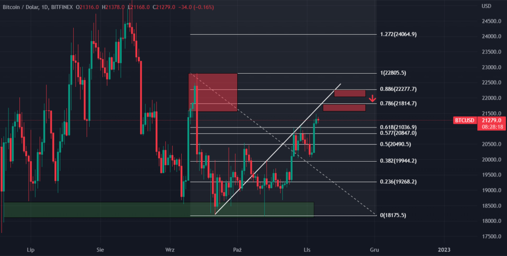 Bitcoin znajduje się w tej chwili na stosunkowo podobnym poziomie co tydzień temu, jednak jest to już kolejny test poziomu. Rynek kryptowalut w odniesieniu do decyzji Rezerwy Federalnej 2 listopada zaliczył spadek. Można zauważyć, iż cały czas jest to reakcja na wcześniejszą linię tendencji. We wcześniejszych analizach sprawdziła się prognoza sugerująca pierwszą reakcję spadkową w okolicy 0.618 mierzenia Fibonacciego i tak też się stało. Kolejnymi strefami do obserwacji ewentualnej reakcji podażowej są okolice 0.786 oraz 0.886, czyli wartości w rejonie 21 800$ oraz 22 400$. Te poziomy są też wyznaczone przez strefe podażową na wykresie dniowym, która powstała 12 września.