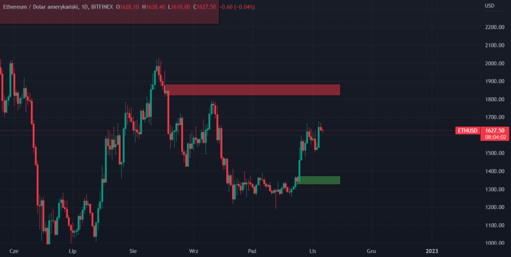 Drugim scenariuszem jest odreagowanie spadkowe w najbliższych dniach, ale w takim przypadku zasięg potencjalnych spadków nie powinien przekraczać dziennej strefy popytowej w okolicach 1350$. Z tej strefy powinna rozpocząć się kolejna reakcja wzrostowa.
