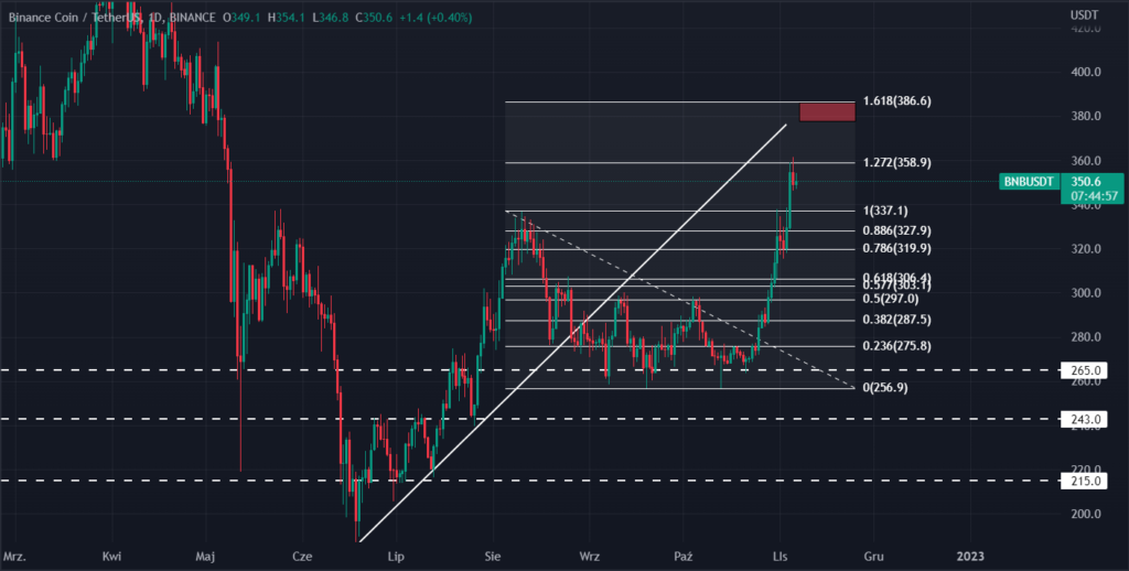W dalszych godzinach reakcja podażowa może nastąpić dopiero w okolicy 380$, gdzie wartość jest wyznaczona przez mierzenie Fibonacciego 1.618. Na moment pisania artykułu reakcja jest już na poziom 1.272 – do obserwacji. jeżeli te poziomy zostaną przebite w kolejnych dniach, dalsze wzrosty mogą sięgać choćby 450$ w dalszej perspektywie.
