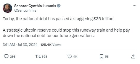https://x.com/SenLummis/status/1818092133812670604Pomysł gwałtownie wywołał lawinę komentarzy i spekulacji. Simon Dixon, analityk finansowy, ocenił, iż ustawa o strategicznej rezerwie Bitcoinów to jedyne rozwiązanie problemu zadłużenia USA. Kilka dni temu dług publiczny Stanów Zjednoczonych osiągnął 35 bilionów dolarów. To najwyższy poziom w historii.