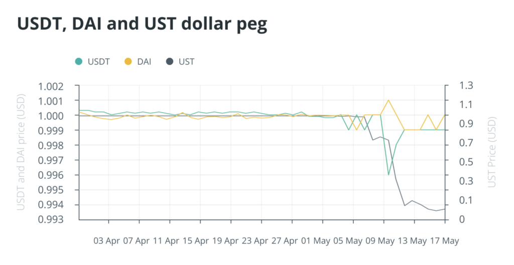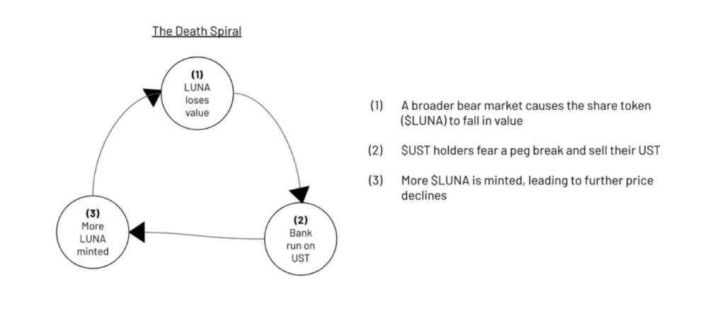 Stablecoin wypuszczony przez Terraform Labs również opierał się na istnieniu dwóch monet, głównej – UST oraz siostrzanej – LUNA, która miała za zadanie absorbować zmienności rynkowe. Za każdego jednego dolara wymintowanego w UST, ekwiwalent jednego dolara w LUNA był niszczony – i odwrotnie. o ile cena UST spadała poniżej jednego dolara, uczestnikom rynku opłacało się spalić UST i otrzymać LUNA, co w założeniu miało przywrócić cenę do pega. o ile cena UST była większa niż jeden dolar uczestnicy rynku mogli wymintować UST poprzez spalenie LUNA, co zwiększyłoby podaż UST i zbiło cenę do jednego dolara. Upadek zaczął się dużymi wypłatami z Anchor Protocol i sprzedażą UST, która spowodowała kaskadę wyprzedaży i jeszcze bardziej zbiła cenę. Podobnie jak w przypadku IRON nastąpiło błędne koło pomiędzy LUNA a UST, które nazywane jest „spiralą śmierci”