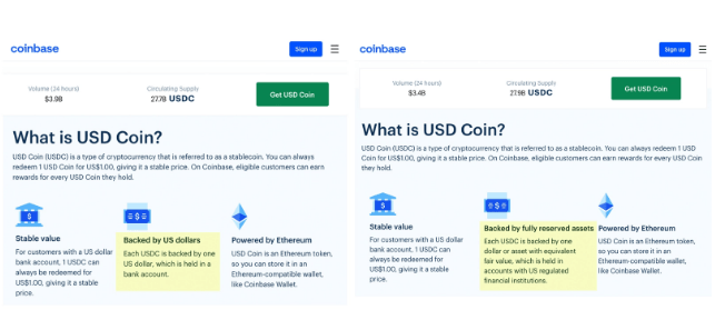 W wyniku ujawnienia tej informacji wiarygodność USDC została nadszarpnięta, a Coinbase zmuszony został do zmiany opisu USDC na swojej stronie internetowej. Pierwotnie wyświetlało się na niej, iż jest on w pełni pokryty w USD, w tej chwili mowa jest pokryciu w USD i innych aktywach.