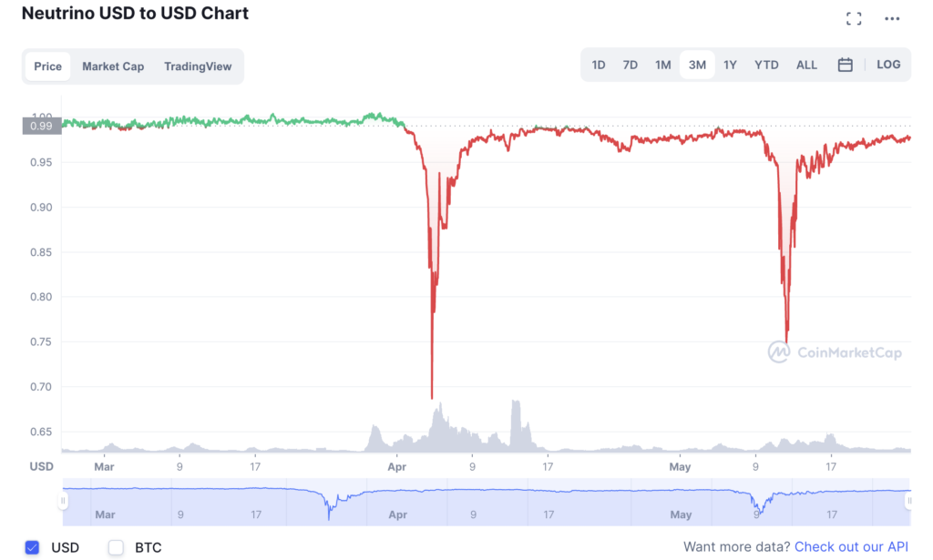 W ciągu ostatnich trzech miesięcy Neutrino dwukrotnie poważnie tracił pega. Pierwszy raz stało się to w kwietniu, gdy część użytkowników oskarżało Waves o manipulacje ceną swojego tokenu poprzez platformę Vires.finance. Drugi raz podczas upadku UST.