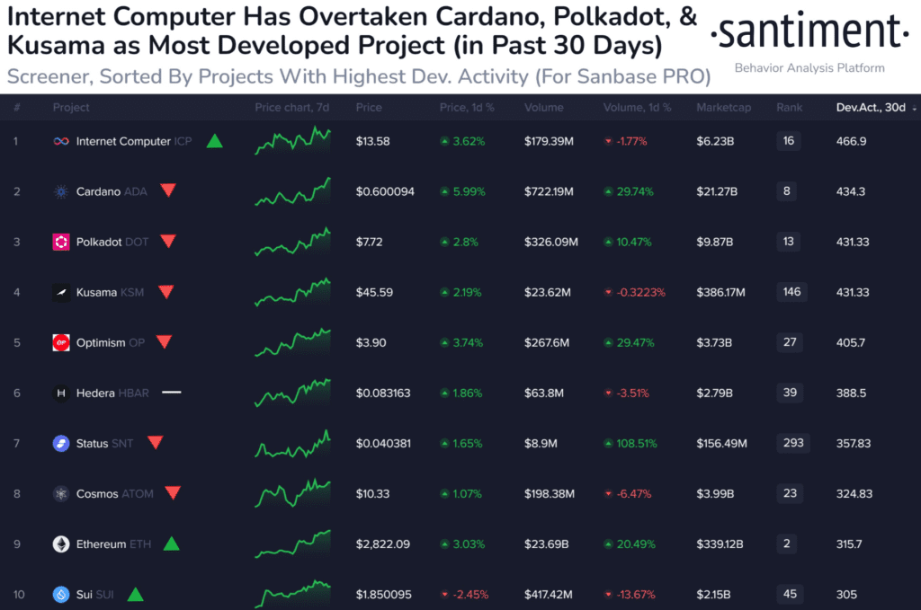 Oto podsumowanie 10 najlepszych altcoinów pod względem aktywności deweloperów w świetle raportu Santiment: