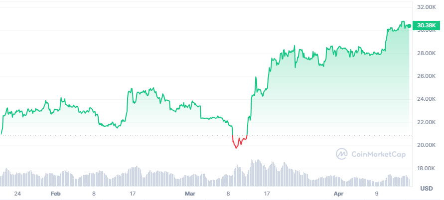 Cena Bitcoina, źródło: CMCKryzys bankowy już za nami, kierunek na wzrosty
