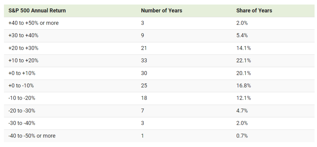 Przez ostatnie 150 lat, indeks S&P 500 najczęściej zwracał od 0 do 20% rocznie (63 lata). Nie bagatelizujmy jednak, iż ok. 54 lata to okres, strat (wyników poniżej 0, do 55%). Rekordowy zwrot przypadł na rok 1933. Najsłabszy był rok 2008. Inflacja w górę, akcje w dół