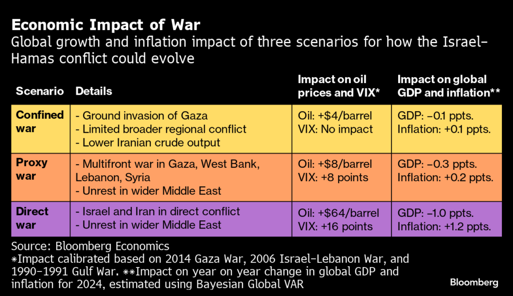 Scenariusz wojny totanej Izrael – Iran wedle prognoz Bloomberga podniósłby ceny ropy o 64 USD i przyniosłby stratę 1% globalnego PKB, przy dolożeniu się o 1,2% do inflacji. gotowe tlo dla giełdowej paniki? Źródło: Bloomberg