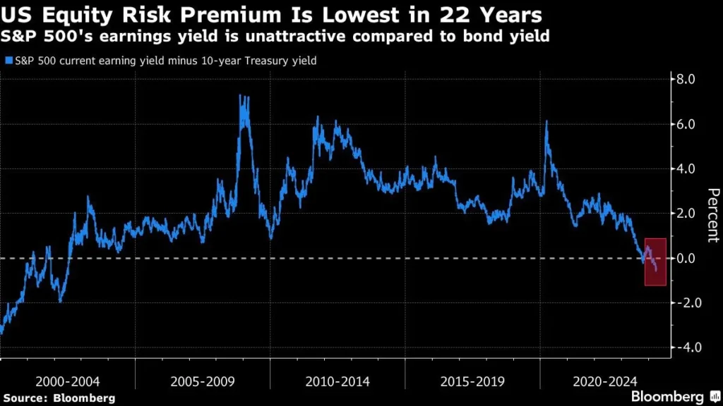 Premia za posiadanie ekspozycji na akcje poprzez indeks S&P 500 jest najniższa od 22 lat. Amerykańskie 10-letnie obligacje skarbu Państwa oferują ponad 5% zwrot, z minimalnym ryzykiem. Średnia roczna stopa zwrotu z S&P 500 to ok. 10%. Tym razem będzie inaczej? Źródło: BloombergPremia za ryzyko