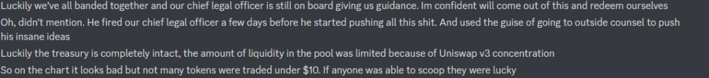 Problem polega jednak na tym, iż zaufanie instytucjonalne, tak ważne dla dużych graczy na rynku, zostało właśnie poważnie podkopane w stosunku do Umami Finance, a to z powodu konfliktu w zespole projektu, a jeżeli wierzyć plotkom z winy samego prezesa O’Donnela, który z bliżej nieokreślonych powodów wyciągnął rękę po ster i ładunek całego okrętu. Kiedy jednak przeciwko niemu wystąpił cały zespół Umami Finance, ogłaszając w proteście swoją rezygnację i próbując utemperować jego zapędy, prezes odwrócił się na pięcie i błyskawicznie zaczął wyprzedawać posiadane przez siebie udziały, de facto sabotując więc wycenę i zaufanie do protokołu.