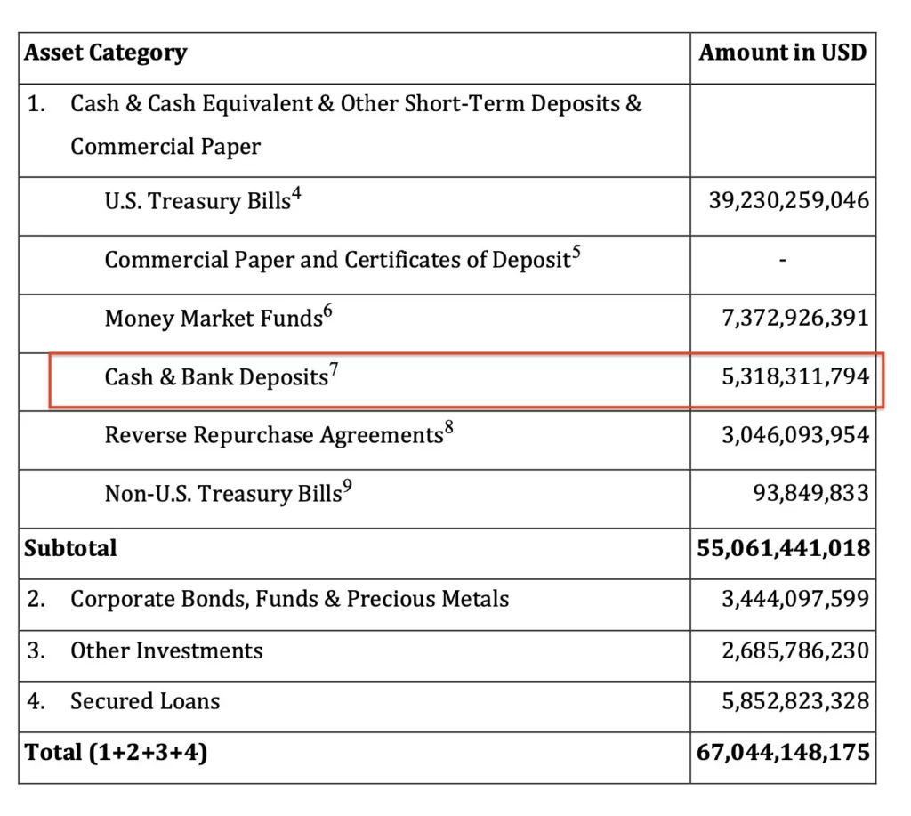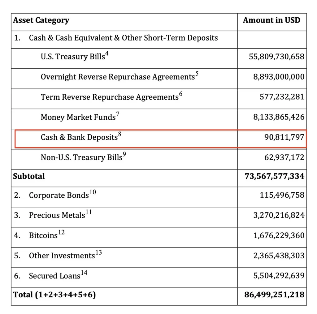 Gotówka i depozyty w bankach Tether na przestrzeni czasu: