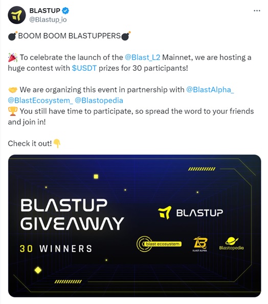 Jako zaangażowany uczestnik ekosystemu Blast, BlastUP odgrywa integralną rolę we wspieraniu wzajemnego wzrostu i postępu. Niedawno nawiązał strategiczne sojusze z innymi uznanymi członkami rodziny Blast, osiągajć tym samym znaczący kamień milowy — długo oczekiwane uruchomienie Blast Mainnet.