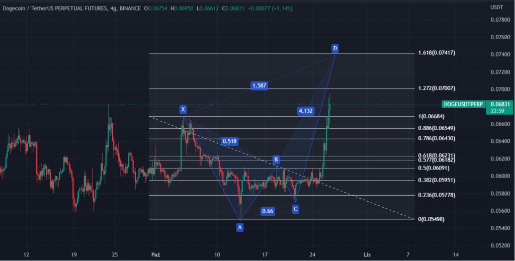 Na wykresie 4-godzinnym widać możliwy do wypełnienia układ harmoniczny z punktem D na 1.618 poziomu Fibonacciego. Jest to potencjalny zasięg obecnych wzrostów i w okolicach 0.074 $ może nastąpić reakcja podażowa. W momencie pisania artykułu cena już reaguje na poziom 1.272 Fibo.