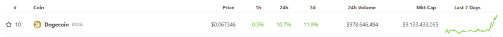 Faktycznie, Dogecoin odnotowuje wzrosty na wykresach dziennych i tygodniowych, zyskując w tej chwili ponad 10% w ciągu ostatnich 24 godzin i prawie 12% w ciągu ostatnich 7 dni, zgodnie z danymi na stronie Coingecko