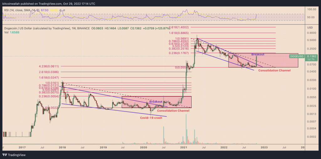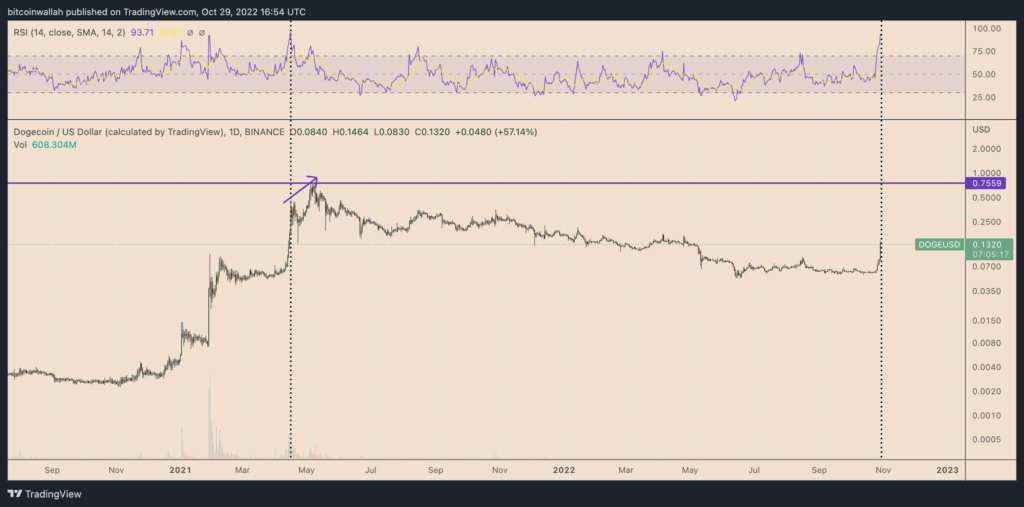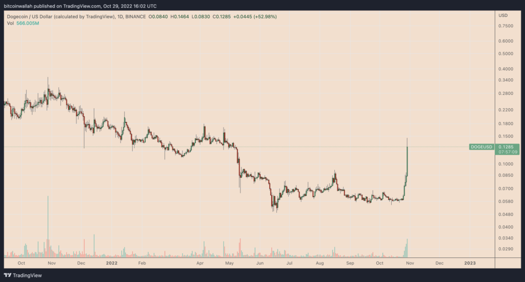 Cena Dogecoin podskoczyła o prawie 75%, aby 29 października osiągnąć 0,146 USD, co jest największym dziennym zyskiem od kwietnia 2021 r.