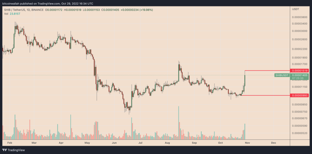 Tylko 29 października cena SHIB podskoczyła o 30% do 0,00001519 USD, najwyższego poziomu od sierpnia 2022 r. Podobnie jak Dogecoin, rajd Shiba Inu był częścią szerszego trendu wzrostowego, który rozpoczął się 25 października. Od tego czasu jego cena wzrosła 53%.