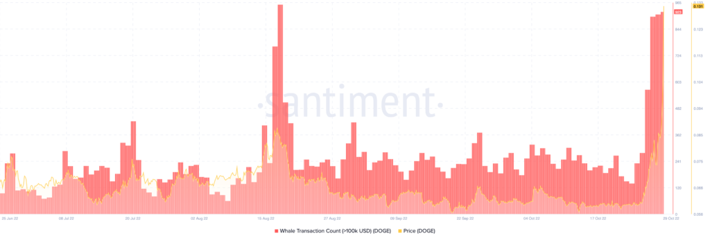 Skok między kluczowymi wskaźnikami Dogecoina odzwierciedla podekscytowanie inwestorów przejęciem Twittera przez Elona Muska 27 października. Na początku tego roku przedsiębiorca-miliarder flirtował z pomysłem uczynienia Dogecoin metodą płatności przy zakupie subskrypcji Twitter Blue.