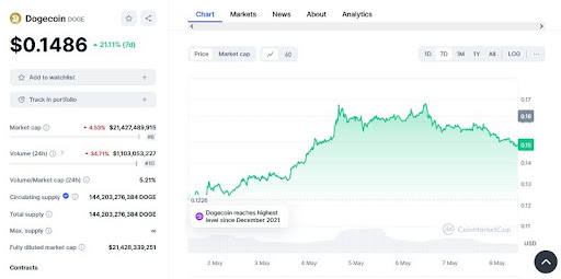 Aktualnie Dogecoin jest w TOP 10 kryptowalut pod względem kapitalizacji rynkowej. W tym przypadku jest to poziom blisko 21 500 000 000 USD. Natomiast za jednego Dogecoina trzeba zapłacić w okolicach 0,15 USD.
