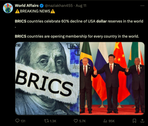 Kraje BRICS są ostatnio bardzo aktywne w dążeniu do zmniejszenia dominacji dolara w międzynarodowym handlu. Szczególnie Chiny, które rozwijają swój system płatności międzybankowych CIPS, który ma stać się alternatywą dla systemu SWIFT, kontrolowanego przez kraje Zachodu. Między czerwcem 2023 a majem 2024 roku, liczba uczestników CIPS wzrosła o 62, co zwiększyło jego zasięg do 142 uczestników bezpośrednich i 1,394 pośrednich. Te mozolne wysiłki zmierzają do stworzenia nowej infrastruktury finansowej, niezależnej od dolara.