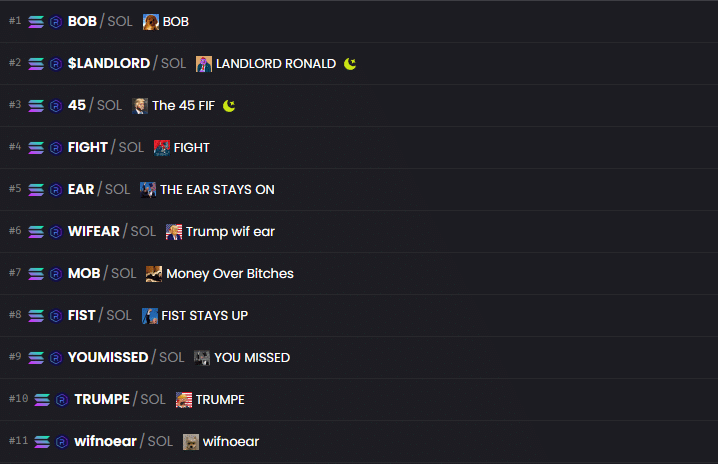 Lista projektów memowych trendujących na platformie Dexscreener, źródło: tamżeWiększość z nich jak zwykle odejdzie w niepamięć kiedy tylko kapitał atencyjny przeleje się z nich w tokeny alternatywne, być może jednak jeden lub dwa zapiszą się w historii krypto memów o ile tylko odpowiedni ludzie i influencerzy będą na pokładzie.