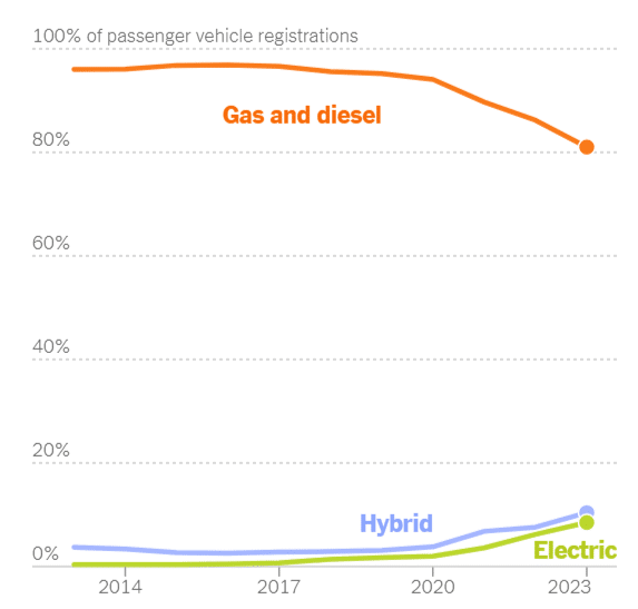 Sprzedaż EV i aut hybrydowych w USA rośnie ale wciąż stanowi tylko ok. 20% rejestracji wszystkich samochodów. Trend jest jednak jasny i klarowny, od 2020 roku. Źródło: New York TimesBez Trumpa rynek EV zaczyna się zielenić