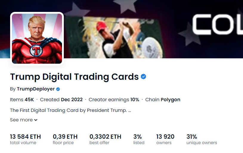 Po pewnej przerwie kolekcja Trump NFT Cards ponownie odnotowała gwałtowny wzrost wartości w ciągu ostatnich kilku tygodni, m.in. w związku z wiadomością o postawieniu zarzutów b. prezydentowi w stanie Nowy Jork. Według danych on-chain z agregatora danych NFT CryptoSlam, projekt wygenerował ponad 19 milionów dolarów w wolumenie sprzedaży od momentu jego powstania. Mimo to w ciągu ostatniego tygodnia liczba aktywnych portfeli posiadających Trump NFT spadła o 13% do 208.