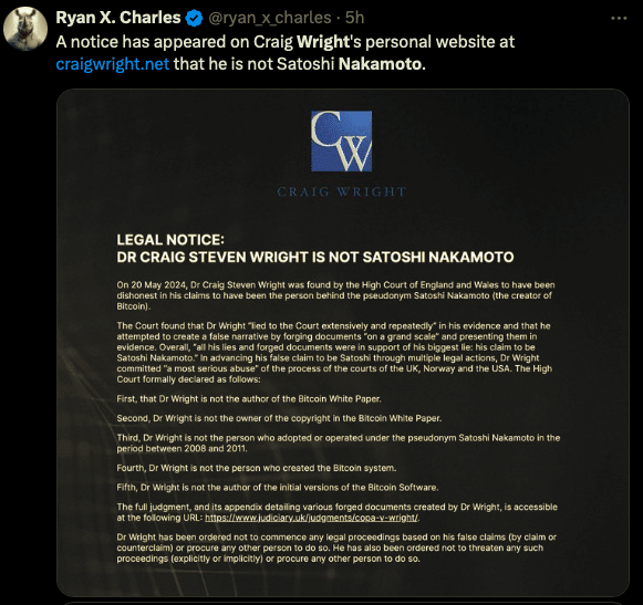 Po marcowej przegranej w brytyjskim sądzie Dr. Craig Wright został zmuszony do publicznego oświadczenia, iż nie jest twórcą Bitcoina, Satoshim Nakamoto. Zgodnie z dokumentami sądowymi udostępnionymi przez BitMex Research, Wright musi zamieścić stosowny komunikat. Zarówno na swojej publicznej stronie internetowej, koncie na Twitterze jak i wszystkich kanałach Slack.