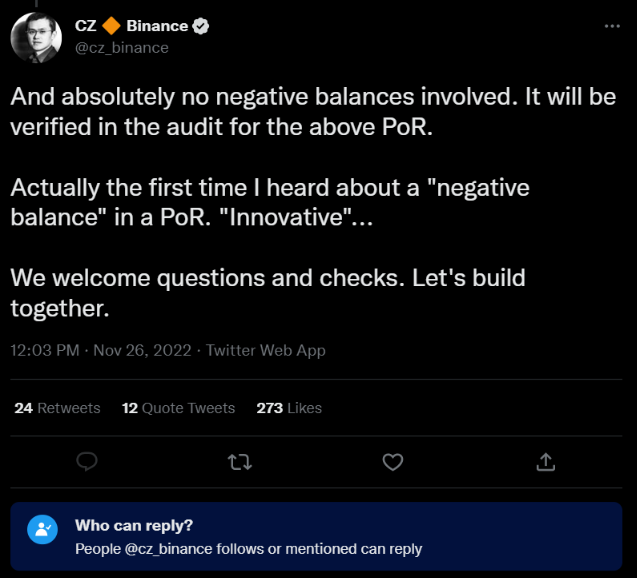 Z drugiej strony niektórzy członkowie społeczności odrzucili sugestie Powella dotyczące wprowadzenia zaufanego audytora do procesu weryfikacji giełdy. Dyrektor generalny Binance Changpeng „CZ” Zhao odrzucił zarzuty kierowane przez Powella, dzieląc się nadchodzącymi planami Binance, które obejmują wprowadzenie audytorów zewnętrznych w celu audytu wyników potwierdzających rezerwę giełdy.