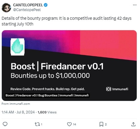 Firedancer to bardzo oczekiwany nowy klient walidatora sprawdzający poprawność łańcucha bloków Solana. Ich twórcy zgłosili się do programistów Solana o pomoc. Oczywiście nic za darmo. Jump Crypto, która jest odpowiedzialna za rozwój Firedance, ogłosiła program nagród dla programistów, który będzie obsługiwany przez platformę nagród Immunefi. Program potrwa 42 dni od 10 lipca do 21 sierpnia. Zatem sześciotygodniowy program nagród za znalezienie błędów w Firedancer v0.1 („Frankendancer”), rozpocznie się już w najbliższą środę. Nagroda dla programisty za znalezienie błędu krytycznego wyniesieni choćby 1 mln dolarów. Nagrody będą wypłacane w USD Coin.