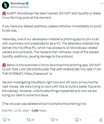 Źródło: https://twitter.com/monoswapio/status/1816151998267547851Ze wstępnych ustaleń MonoSwap wynika, iż 23 lipca jeden z jego twórców przypadkowo zainstalował złośliwą aplikację phishingową i podczas rozmowy telefonicznej padł ofiarą oszustów, którzy udawali inwestorów aktywów wysokiego ryzyka. W trakcie rozmowy oszuści skutecznie zainstalowali złośliwe oprogramowanie na komputerze programisty. Według doniesień programista miał dostęp do wszystkich portfeli i umów platformy. Dzięki temu hakerzy mieli otwartą drogę do wycofania większości tokenów, których użytkownicy używali do stakingu. Póki co MonoSwap nie informuje o rozmiarach strat.
