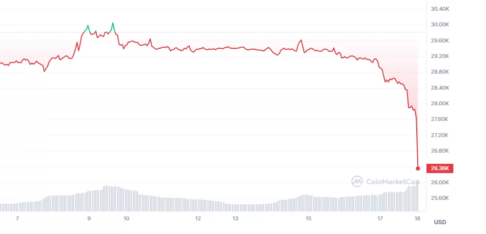 Kurs BTCUSD, źródło: CMCZlikwidowano ponad 130 milionów USD w longach, najwięcej od czasu upadku giełdy FTX.