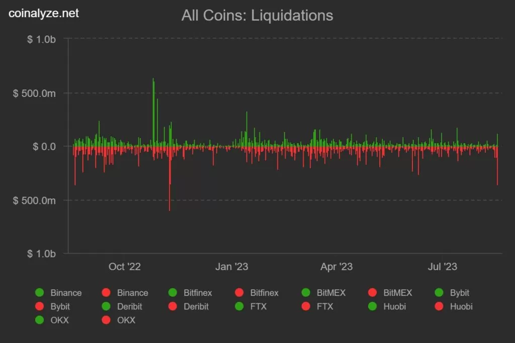 Stopniowo wykrwawiający się Bitcoin tracił grunt pod nogami, co ostatecznie, w okolicy północy 18/08/2023 poskutkowało long squeeze, czyli masową likwidacją pozycji długich obstawiających wzrost kursu BTC. Na giełdzie ByBit deprecjacja sięgała choćby poziomu 24000 dolarów za sztukę.